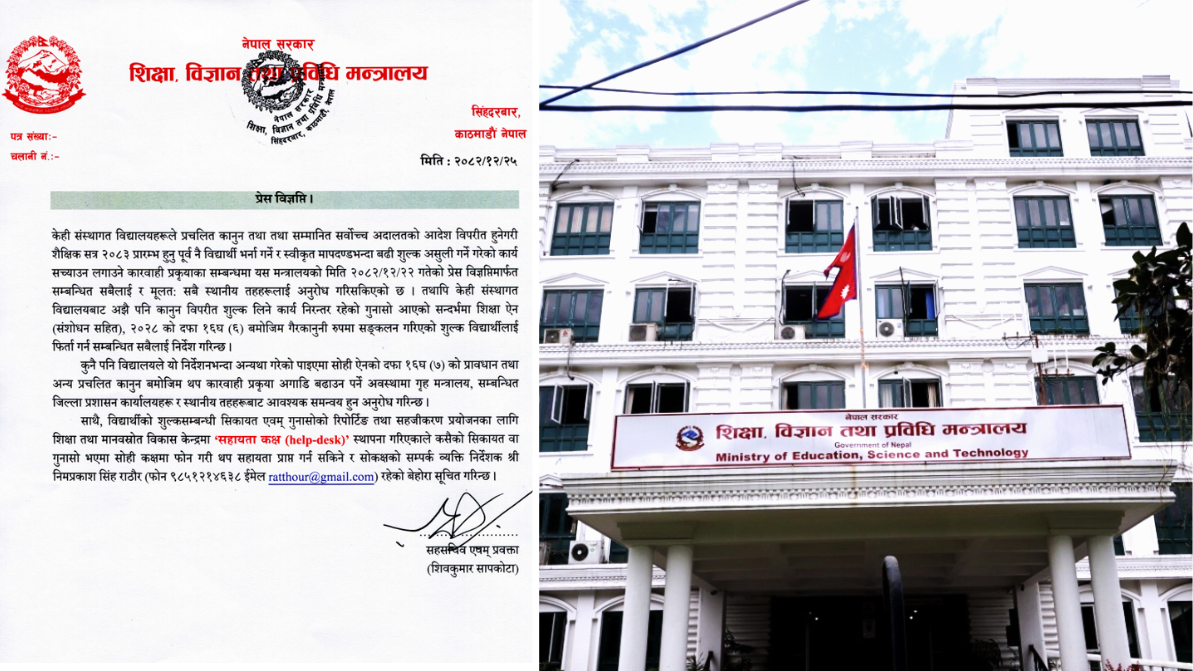 गैरकानुनी रुपमा संकलन गरिएको शुल्क विद्यार्थीलाई फिर्ता गर्न शिक्षा मन्त्रालयको निर्देशन