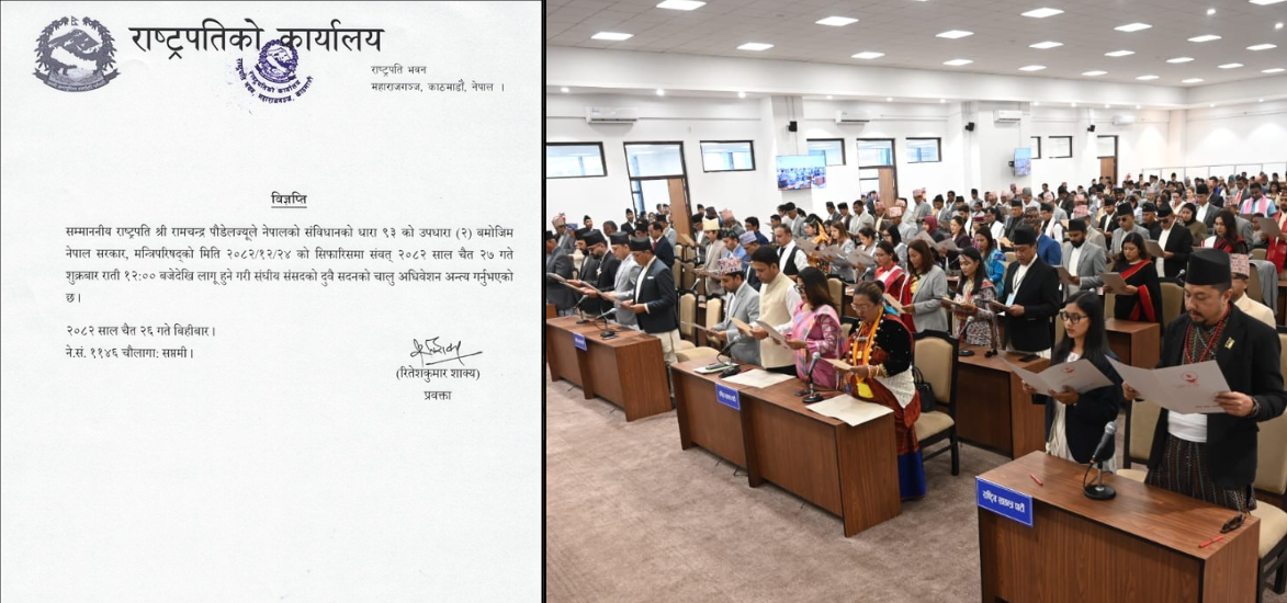 काठमाडौं। संघीय संसद्अन्तर्गत दुवै सदनको चालु अधिवेशन शुक्रबार राति १२ बजेबाट अन्त्य हुने भएको छ। मन्त्रिपरिषद्को सिफारिसमा राष्ट्रपति रामचन्द्र पौडेलले अधिवेशन अन्त्य गर्ने भएका हुन्। शुक्रबार दिउँसो ३ बजे राष्ट्रपति पौडेलले संसद्को संयुक्त सदनलाई सम्बोधन गर्ने कार्यक्रम छ। उक्त बैठकपछि चालु अधिवेशन अन्त्य हुनेछ। ‘राष्ट्रपति रामचन्द्र पौडेलले नेपालको संविधानको धारा ९३ को उपधारा (२) बमोजिम […]